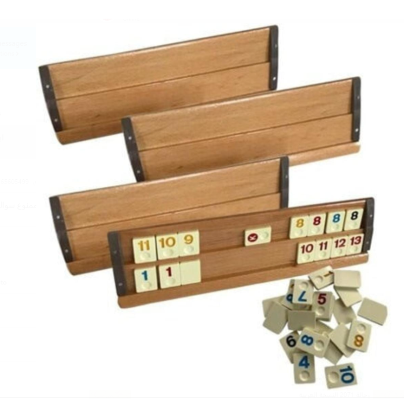 تحتوي اللعبة على 4 ارفف خشبية، 106 بلاطة ، حافظة للبلاطات.