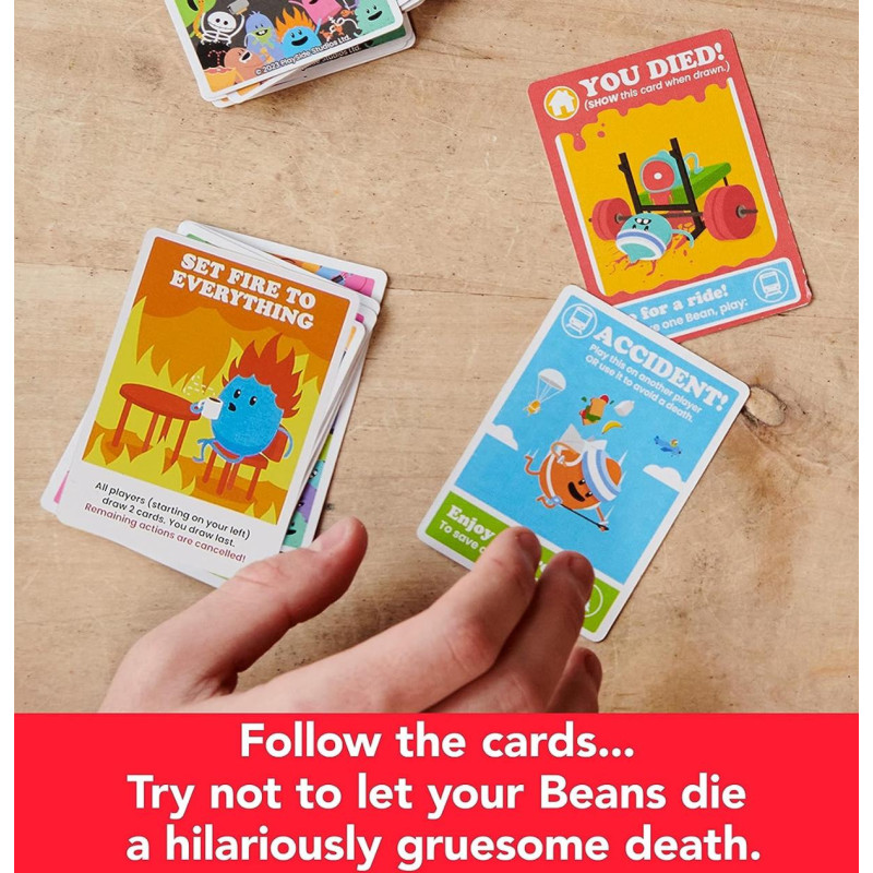 HOW TO PLAY: Don’t let your Beans die! Fair warning, these Beans will ALWAYS find dumb ways to die. Their survival depends on cards that MIGHT help. In the face of almost certain death, you better hope that everyone else dies first.