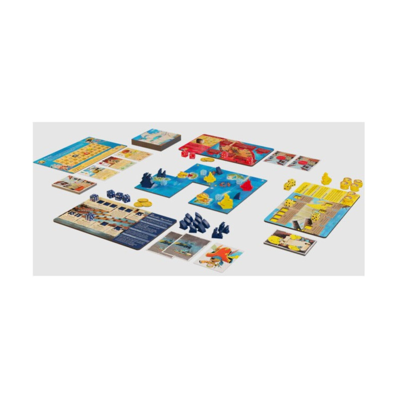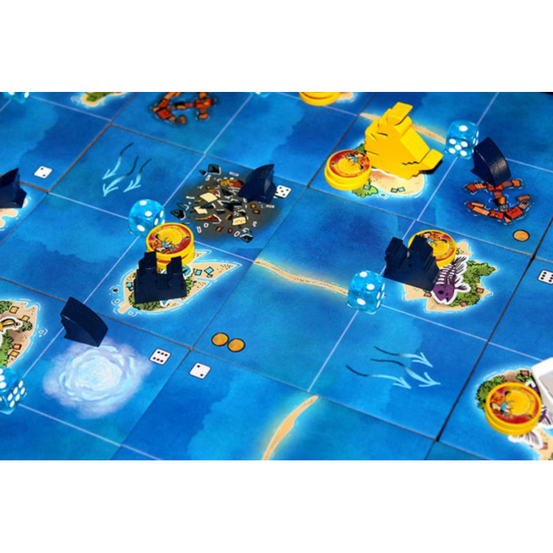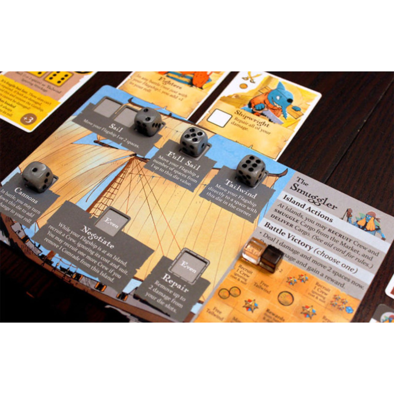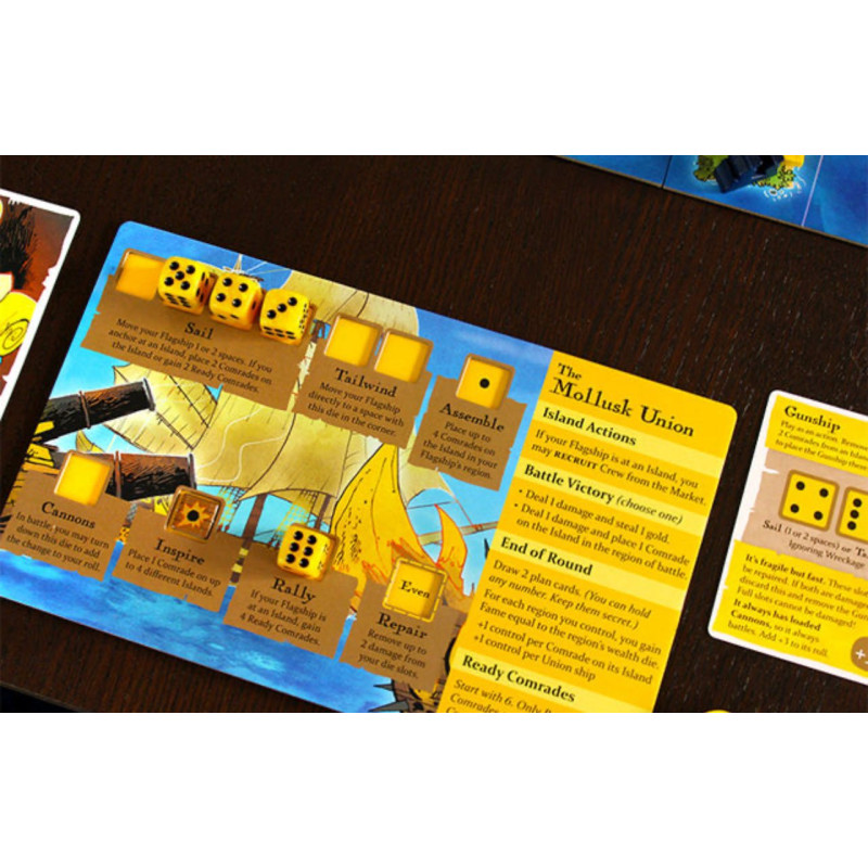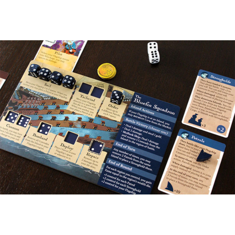 You are swashbucklers and soldiers on the high seas. Each round, you’ll roll and place dice to take the unique actions of your faction. As you control regions and deliver cargo, you’ll gain Fame. The player with the most Fame wins!