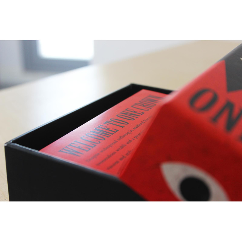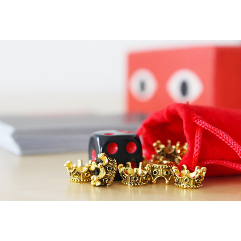 One Crown is a medieval card game of betrayal, lies, and manipulation. You and your friends play as cunning nobles, each scheming to seize the throne. The twist? One of you begins as the king, but power rarely lasts for long. Your goal is simple: collect the most gold and end the game as king after 4 rounds. To get there, you’ll need to play your cards wisely. Each card unlocks unique actions that can turn the tide in your favor, from clever tricks to ruthless betrayals. Maybe a rival has been annoying you all game. Drop the Royal Parrot card, force them to hand over 100 gold, and make them repeat any sentence you choose in a ridiculous high-pitched voice. Every round brings new surprises, shifting alliances, and moments of pure chaos. What never changes is the guarantee: an unforgettable, laughter-filled experience with friends and family. One Crown is played with 4–8 players. The objective is to collect the most gold and end the game as king in 4 rounds. At the start, one player becomes the King by drawing the red Character Card, while everyone else plays as a Noble. The King begins with 1000 gold, and each Noble starts with 600. Players track their gold using the small crowns placed on their Character Cards. The King has a unique deck designed to turn nobles against one another, while the nobles share a separate deck. Each player begins the game with 8 cards. All the cards have actions on them, and many of them are different. They allow you to take gold from other nobles, protect yourself, split people apart, and do a wide range of things. Place the round counter in the center of the table. It shows whether play will move clockwise or counterclockwise for each round. A round begins with the King, who plays 3 cards and draws 3 (or 2 and 2 if there are only 3 nobles). Then, each Noble in turn plays 2 cards and draws 2, continuing around the circle until it comes back to the King. After everyone has taken their turn, the Deal Phase begins. For 1–2 minutes, players may negotiate, trade gold, swap cards, or make deals with one another. Once the deal phase ends, a new round begins. Play continues for 4 rounds in total. At any point during the game, if a Noble surpasses the King in gold, they immediately switch seats with the King, taking their crown, deck, and gold. After the fourth round, the player who holds the crown and has the most gold wins the game. To summarize everything. Hand out character cards and use them to track your gold. Whoever gets the red one is the king. Then hand out 8 cards to each player. Start at the king, they play and draw 3. The next player after them plays 2 and draws 2 until everyone's turn is over. After everyone is done start the deal phase and exchange gold, favors, cards for 1-2 minutes. Then repeat for 4 rounds. Whoever ends the game as king wins. - Around 100 cards - Round counter card - Game guide - Red pouch with dice and small crowns