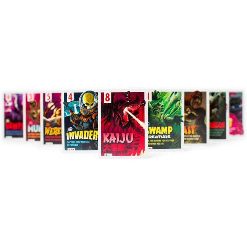 *The definitive board game for monster lovers* featuring 10 original illustrations of classic horror monsters like Blob, Kaiju, Invisible Man, Swamp Creature, Demogorgon, and more!
