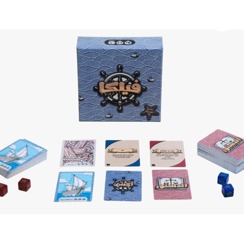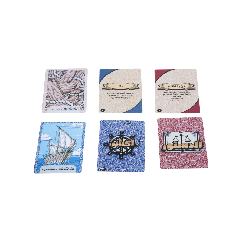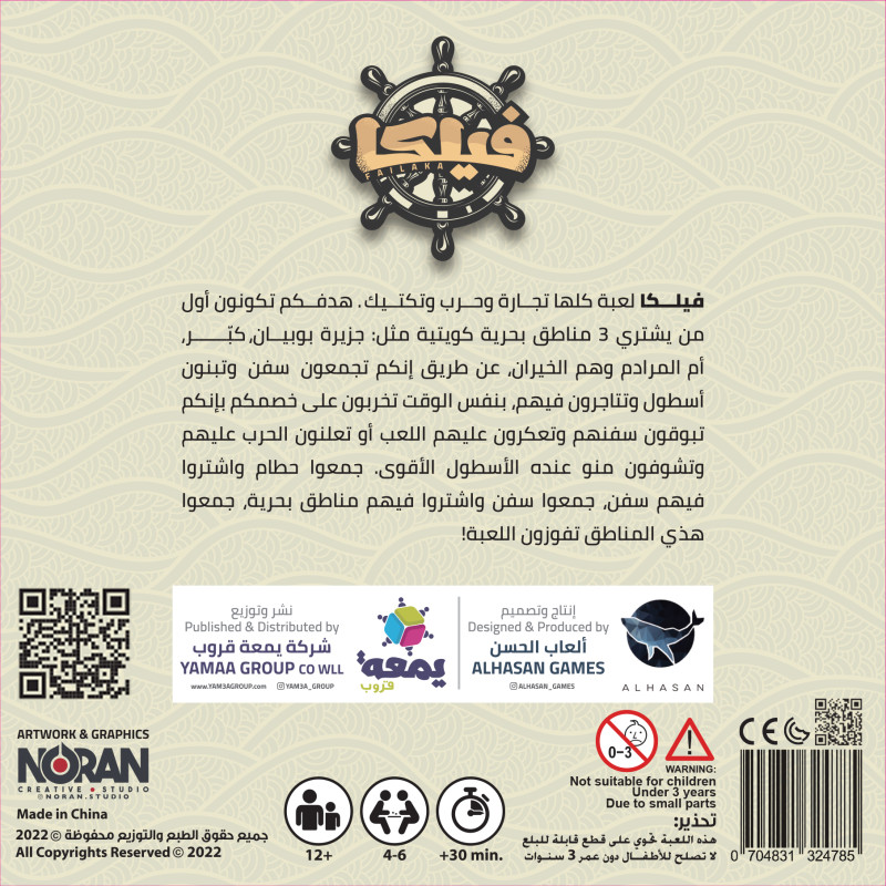 Failaka is a game of trade, war and tactics. Your goal is to be the first to buy 3 Kuwaiti marine areas, such as: Boubyan Island, Kubbar, Umm Al-Maradim, and others. By collecting ships, building a fleet, and trading with them, and at the same time you are wreaking havoc on your opponent by sounding the horns of their ships, or declaring war on them and seeing who has the strongest fleet. Collect debris and buy ships, collect ships, and buy areas. Collect these areas and you win the game. A game of planning, intelligence, cunning, form friendships, and war comes in seconds. • Players: 4-6 • Age: 12+ • Time: 30 min. • Dimensions: 16x16x5 cm
