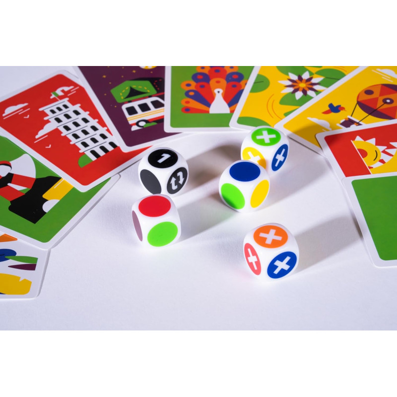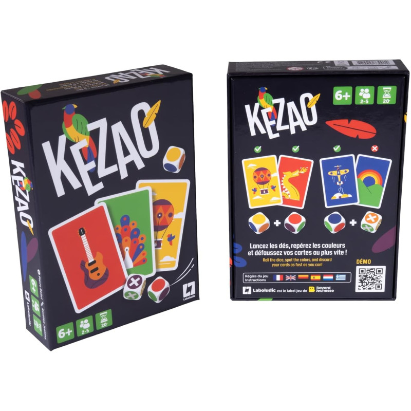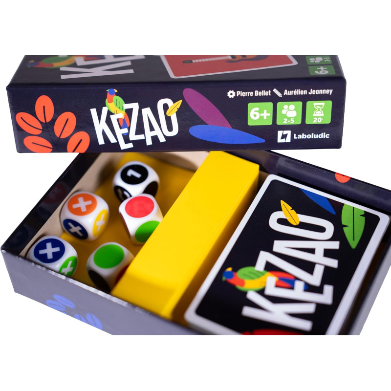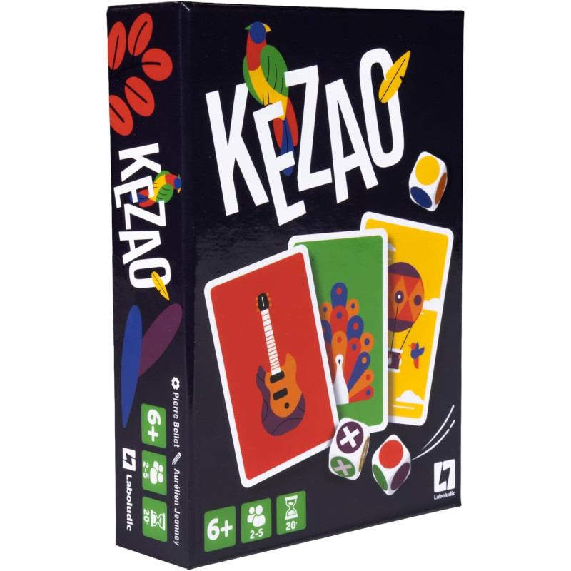 Kezao is a speed game that calls on one's sense of observation of the colours displayed on a picture. Players must find a card in their game, compatible with the colour indications, present or absent, displayed on the dice. The aim of the game is to be the first to discard all of one's cards.