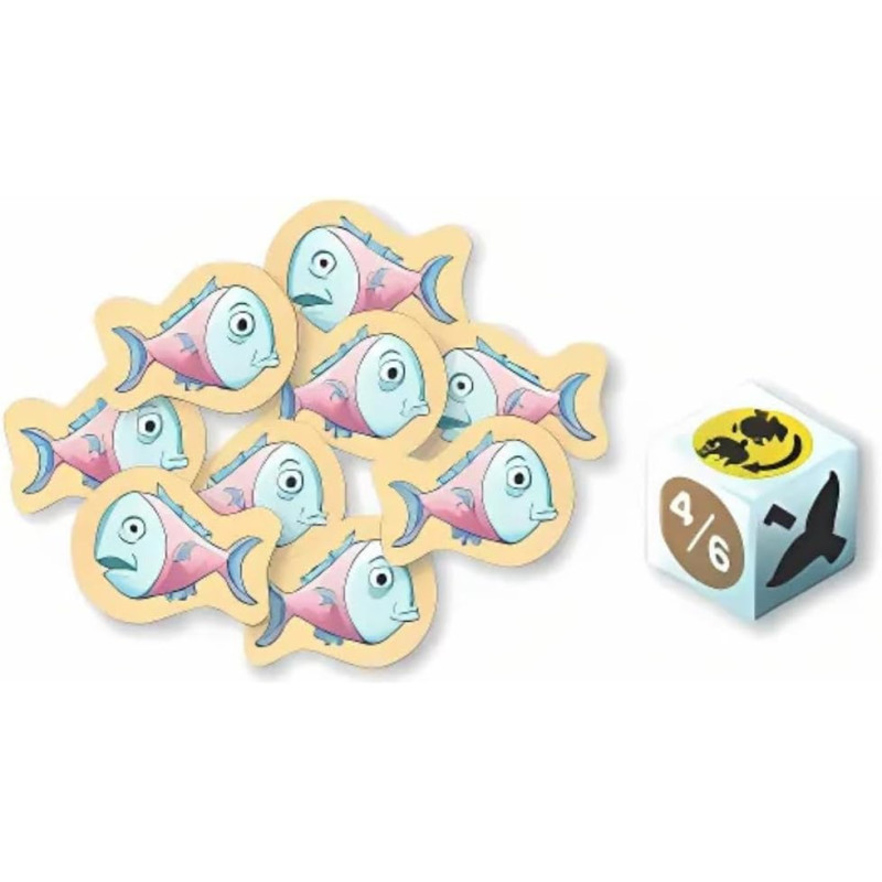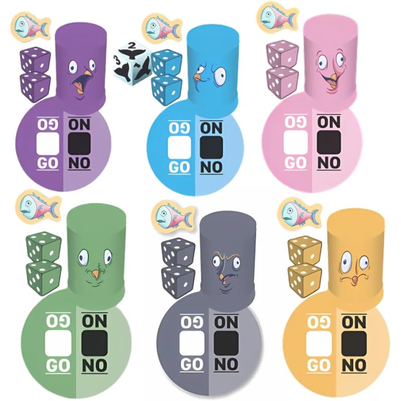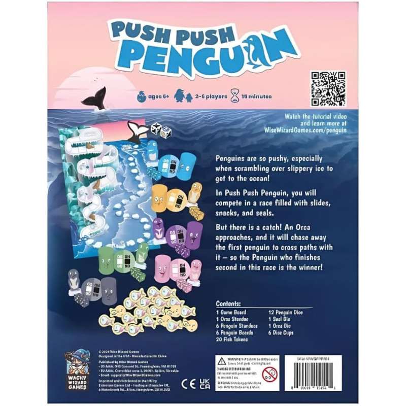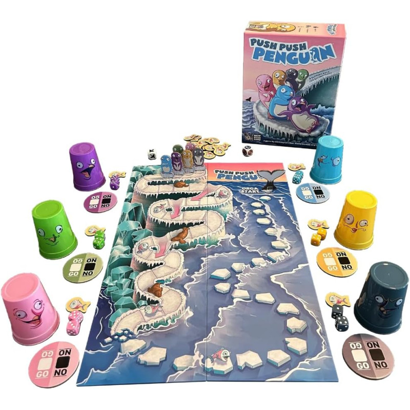 To play, all players roll their Penguin Dice. Players use their Penguin Cup to shake their dice and hide them. They secretly select which of their dice they want to use for movement then reveal the dice at the same time. Starting with whoever has the Orca Die, each player takes a turn gobbling up fish and moving their penguin. They push any penguins they land on or interact with special spaces. After all players have taken their turn, the player with the Orca Die rolls it and moves the Orca.