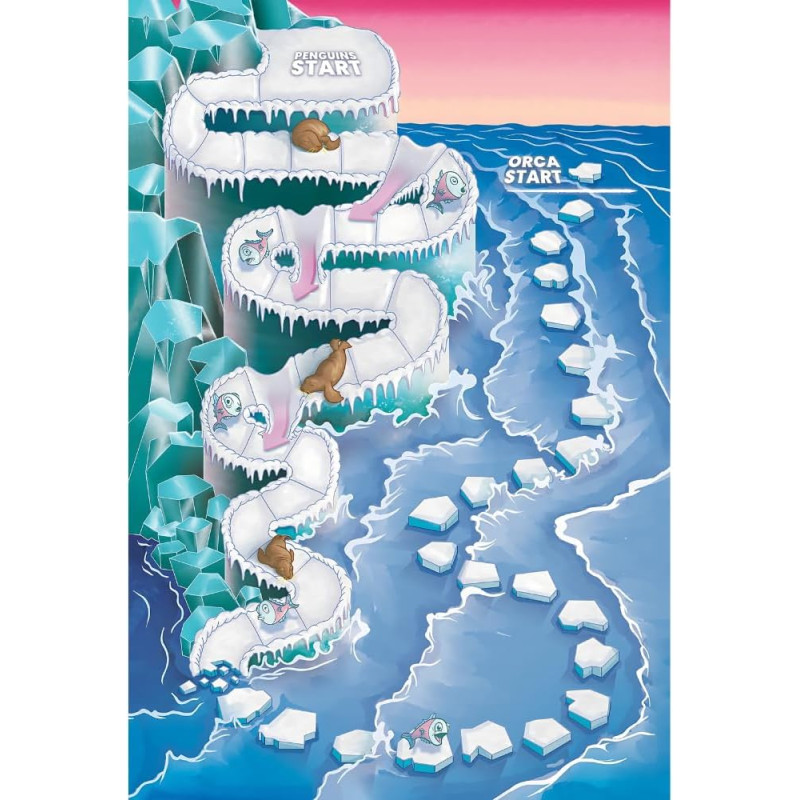 The game ends when the Orca moves onto a Penguin’s space and the Penguin is not able to gobble up fish tokens to keep from being scared away by the Orca.