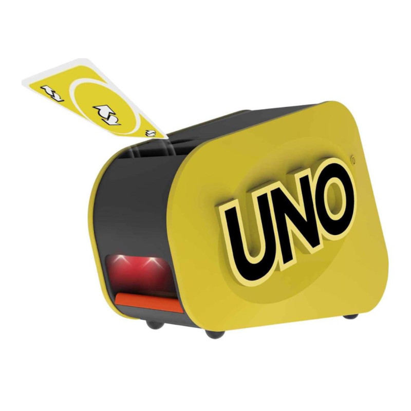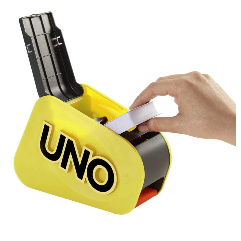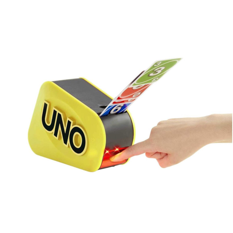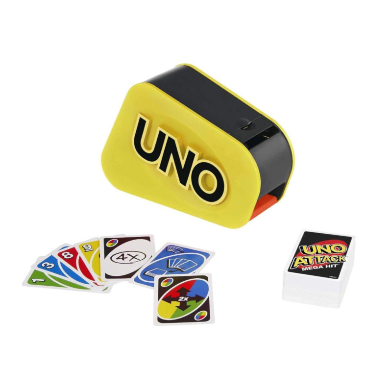 This version of the UNO Attack Mega Hit Launcher brings action, suspense and surprise with its sleek look, cool lights and sounds and high-shooting cards! Lights and sounds build over time for extra excitement!